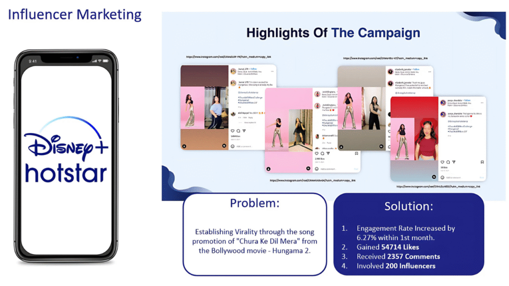 We focus on real metrics. Our campaigns aim to deliver results by partnering with influencers who match your brand’s tone, target audience, and values. We work with influencers from nano to celebrity levels based on your goals, industry, and budget. Our Performance Metrics Speak Volumes We have successfully run impactful influencer campaigns for brands like Netflix, Disney+ Hotstar, and WishCare. The numbers show our success: